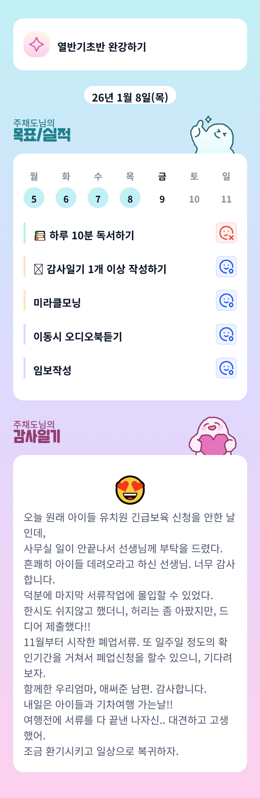 그간 달려왔던 일정들이 상상이 되네요... 여행 전 무거운 것들 마무리 하고 시원하게 여행 떠나실 수 있게 되셔서 다행입니다! 몸과 마음 편하게 쉬시고 가족들과 찐한 시간 보내고 힘 얻어서 2주차도 같이 달려보아요~!