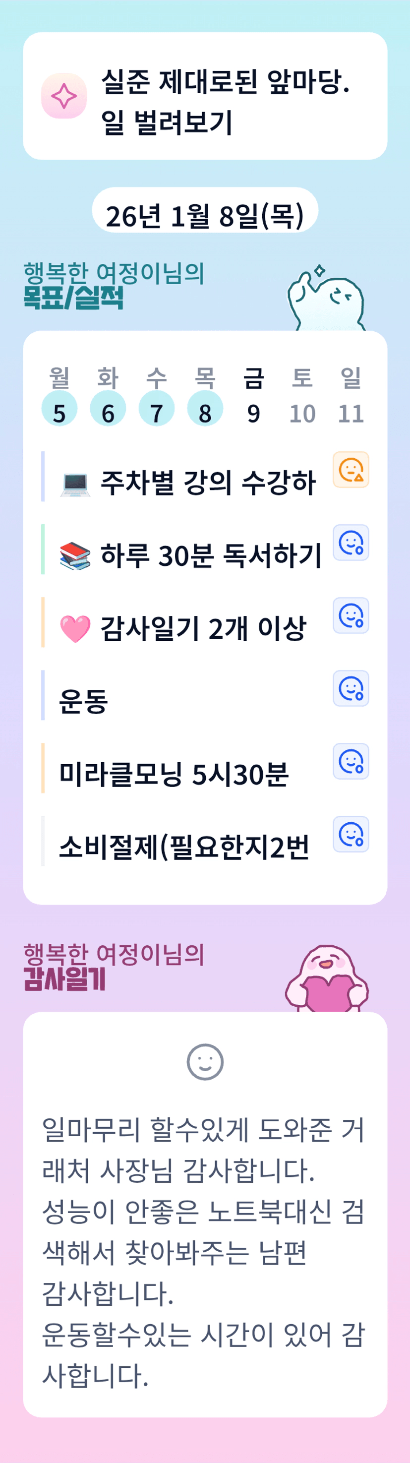 오늘의 목실감 완료하신 여정이님. 대단합니다. 내일 목실감도 완료 도전!!