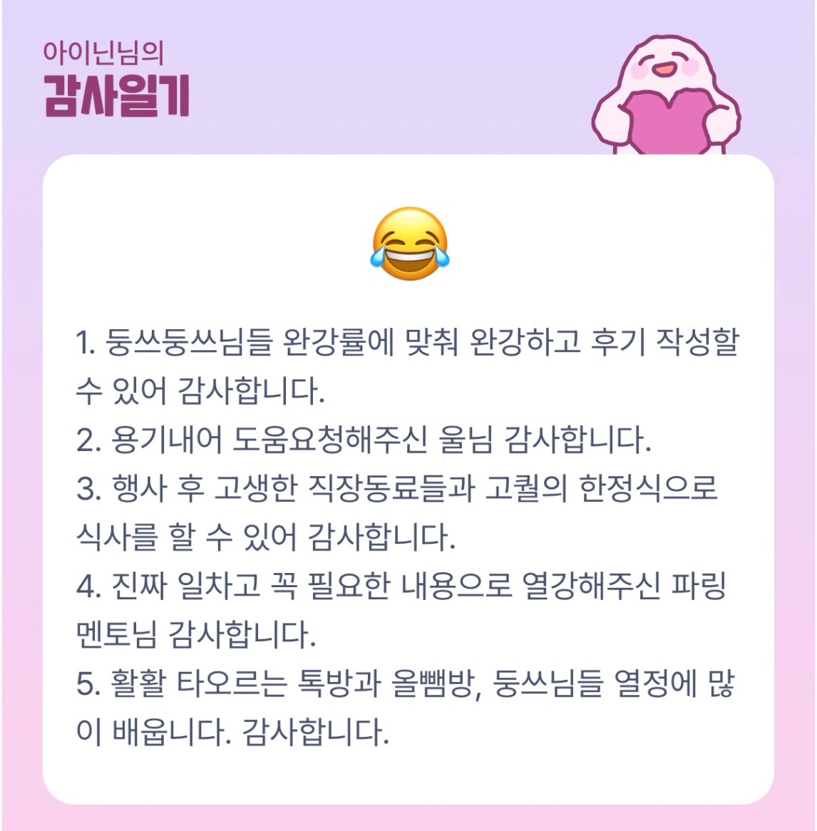 업무에 지쳤음에도 완강과 후기 넘 고생 많으셨어요😊 병원 잘 다녀오세요!! 가벼운 것으로 병원을 가신 거였음 좋겠어요☺️ 오늘도 힘내세요😁