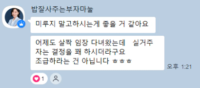 이 톡방에만 오면 마음이 편안해지는 마법… 각자 자신만의 속도로 꾸준히 해내고 계신 여리님, 권님, 별님, 리치님, 핑님, 돌맘님, 짠쓰야님 항상 따수운 댓글들로 위로해주셔서 감사해요!! 1호기 위해 달리시는 권님, 별님, 핑님 좀만 더 힘냅시다!!! 꼭 좋은 결과 있을거에요 기다리고 있을거에요! 제대로 안하면 멱살잡습니다^^^^^^ 따뜻하게 쪼아대기ㅋㅋㅋㅋㅋㅋ