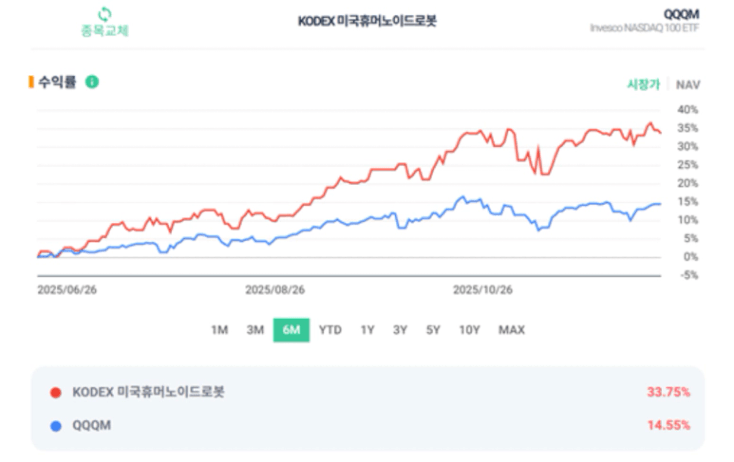 KODEX 미국휴머노이드로봇 ETF의 6개월 투자성과 토털리턴(배당재투자 포함) 은 33.8%로 QQQM의 15.6%에 비해 좋은 성과를 보였습니다.  25년에는 휴머노이드의 직접 수혜보다는 AI 관련하여 좋은 성과를 보였습니다. AI의 군비 경쟁이 계속될 것으로 보이고 있고, 26년에는 로봇의 실제 성과가 부각되면서. 로봇 ETF가 좋은 성과를 보일 것 같습니다.