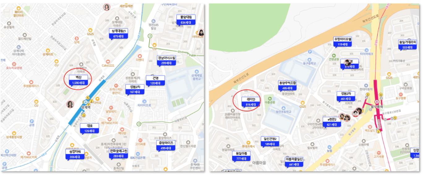 위의 노원구에는 벽산이라는 단지는 4호선 초역세권단지, 구리에는 8호선 동구릉역 역세권인 아름마을인창래미안이라는 단지가 있습니다. 만약 이걸 보시고, 여러분들이 이렇게 생각했다면 위험합니다.
