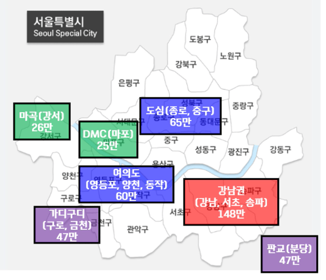 위 이미지를 보시면 강남권/여의도/도심권이 가장 규모가 큰 것을 볼 수 있습니다. 이 중에서도 강남권이 가장 크죠. 따라서, 서울수도권에 있는 많은 사람들이 강남권에 인접해서 살고 싶어하는 수요가 큰 것을 알 수 있습니다.
