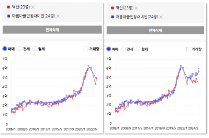 2022년까지만 비슷했던 가격이 이후엔 확연히 차이가 나는 것을 알 수 있습니다.