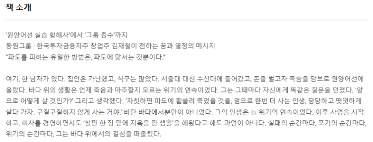 “사업을 하더라도 가족들 굶지 않게 대책을 세워놔라.” … 별다른 게 없었다. 사업을 하다 쫄딱 망하면 할 수 있는 일은 다시 배를 타는 것뿐이었다. 선장 월급이면 그래도 먹고사는 데는 지장이 없으리라는 생각에 이르자 마음이 조금 편해졌다. … 최악의 상황에 대비해 선원수첩을 보관하고 있었다. … 사업, 투자, 인생 모두 마찬가지다. 최악의 상황에 대비한 마지막 피난처는 있어야 한다.