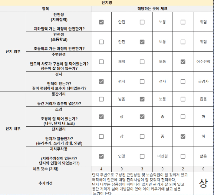아이를 키우는 입장에서 살고 싶은 단지인지 보시면 좋을 것 같습니다.