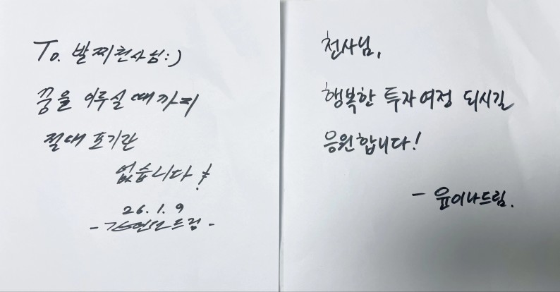 응원해 주시는 만큼 꿈을 향해 절대 포기하지 않고 꾸준히 나아가는 행복한 투자자가 되겠습니다.^^ ❤️💙🤍