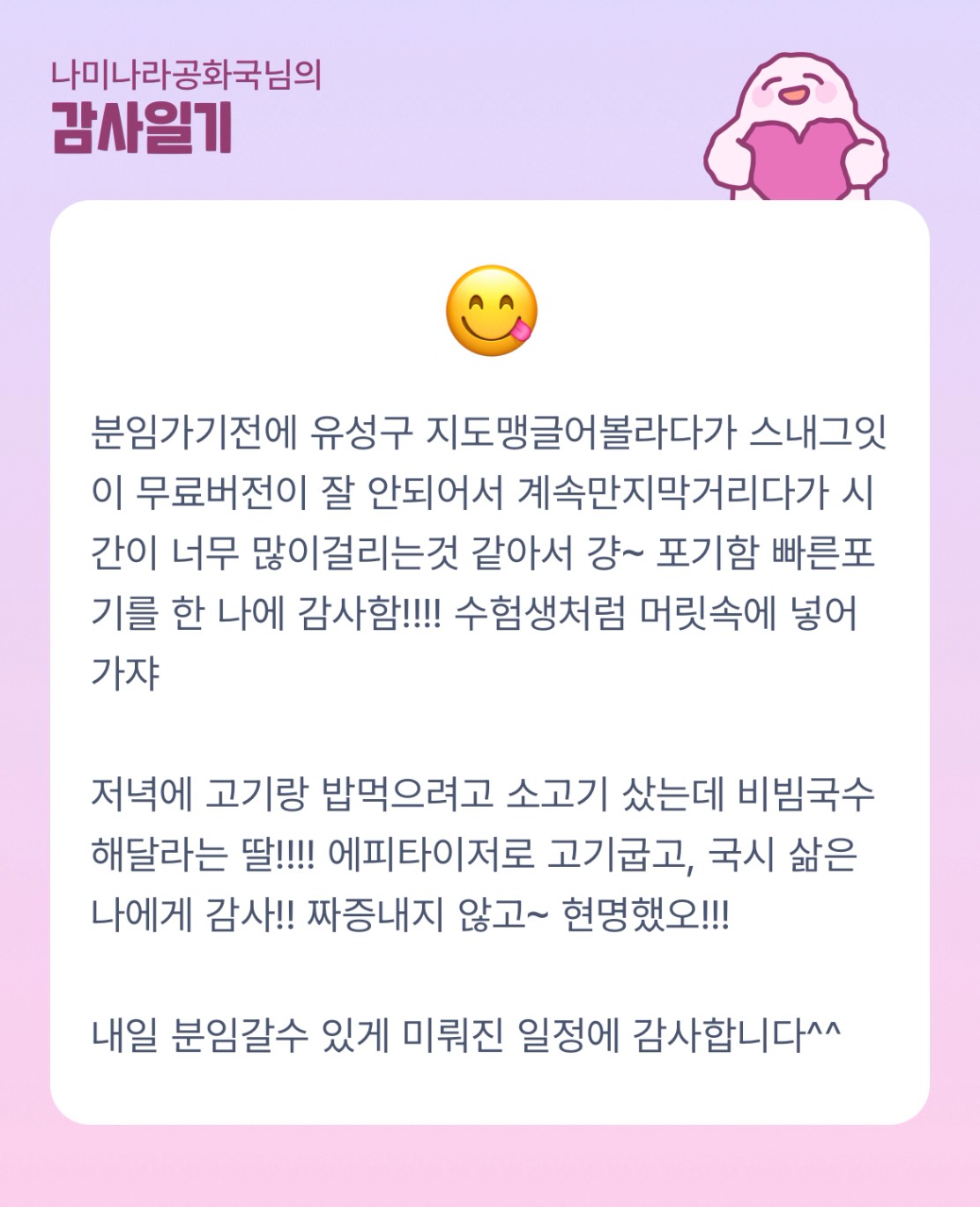 뭔가 잘 안될때의 그 빡침...! 빠른 포기가 답일때가 있는것같아요ㅠㅠ 비빔국수에 소고기라니 따님이 맛잘알이시네요ㅋㅋㅋㅋ 잘 대처하신 나나공님 최고👍