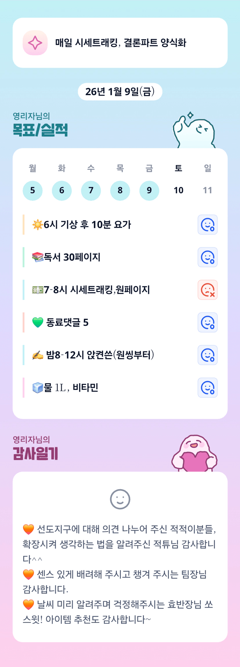 조장님 ㅎㅎ 저녁 7시부터 12시까지 하루 5시간 루틴세팅 넘 멋지셔요ㅎㅎ 화이팅!!