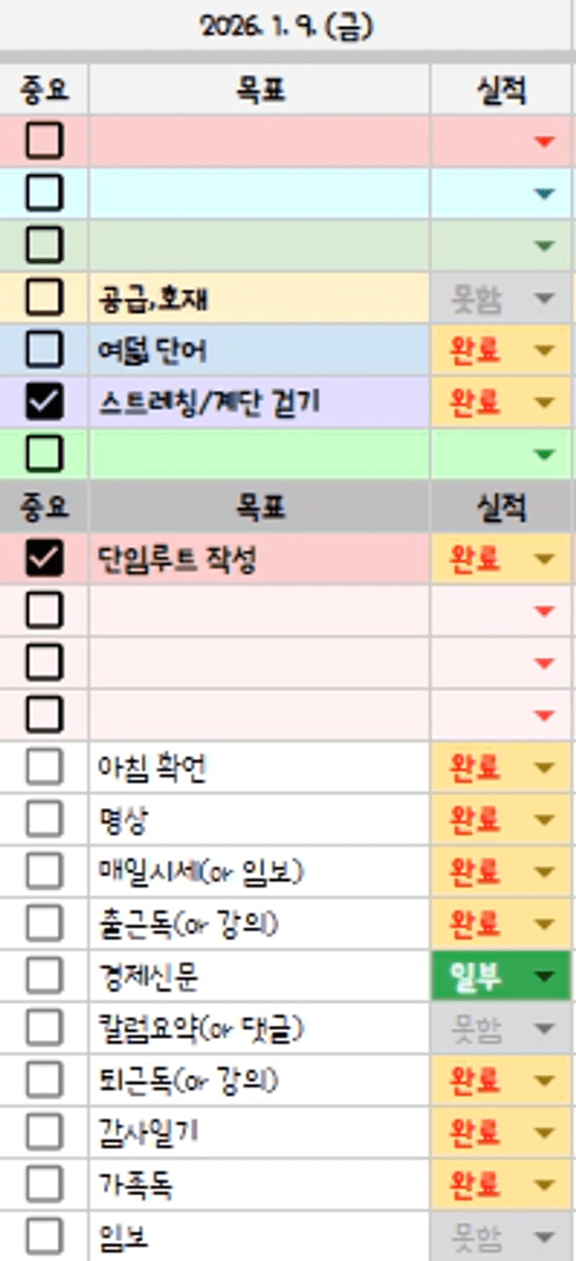 20270109 감사일기아침식사와 건강 챙겨주는 와이프 감사합니다.본질에 대한 생각 감사헙니다.(읽는 책의 본질!, 임장지의 본질!, 나의 본질!)업무 중간 임장 준비시간 감사합니다.가족과 함께하는 독모시간 감사합니다.