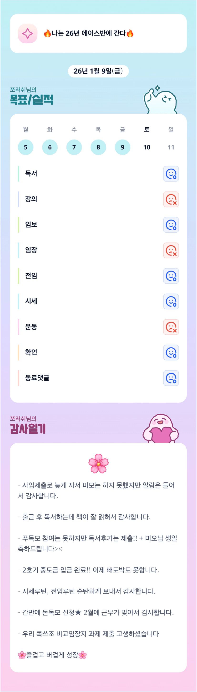 조장님 고생하셨어요~!!! 오~ 2호기 중도금까지 보내셨군요!!👍👍 26년 에이스반 꼭 가시길 바랄게요~^^