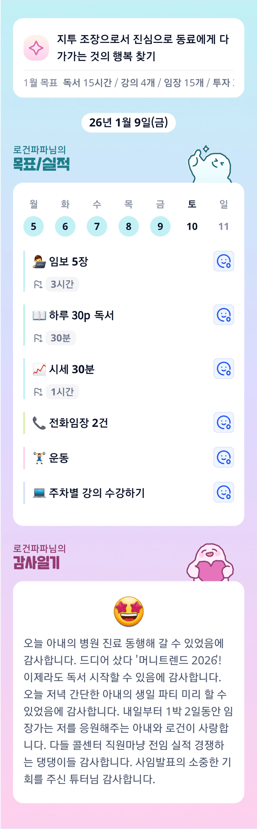 나는 참 행복해. 못할 것도 없지. 나는 참 풍족해. 정말 감사합니다. 나는 긍정적이고 꾸준한 루틴으로 끊임없이 성장한다. 6년 안에 30억, 16년 안에 100억을 부동산 투자를 통해 이룬다.