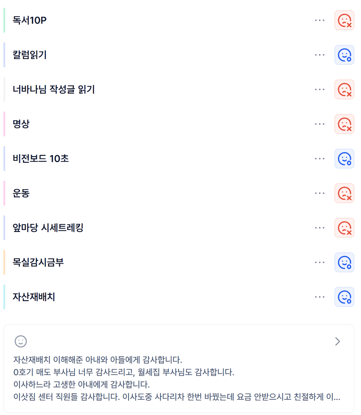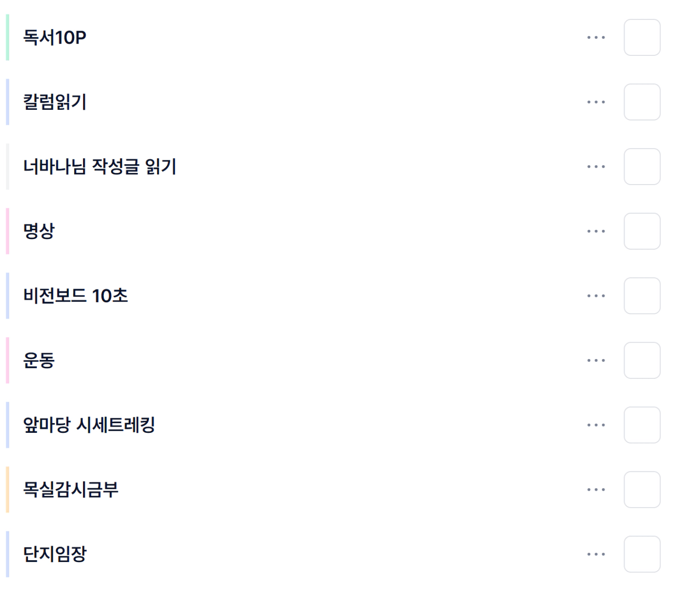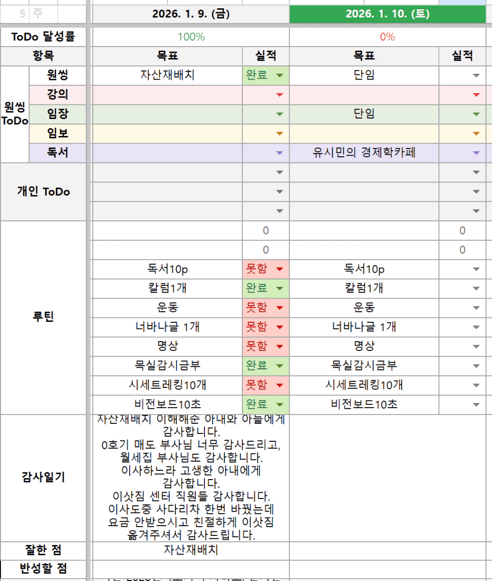 나는 건강한 사람이다.나는 부단히 노력하는 성실한 사람이다.나는 2026년 서울, 수도권 앞마당 10개 늘린다.나는 2028년 4호기 투자하고, 순자산 15억 달성한다.나는 2030년 5호기 투자한다.꾸준함은 성공의 최고 덕목이다. 나는 꾸준히해서 2035년 30억 부자가 된다.나 우가행은 해내는 사람이다. 나는 한다.나는 해낸다.나는 반드시 된다.