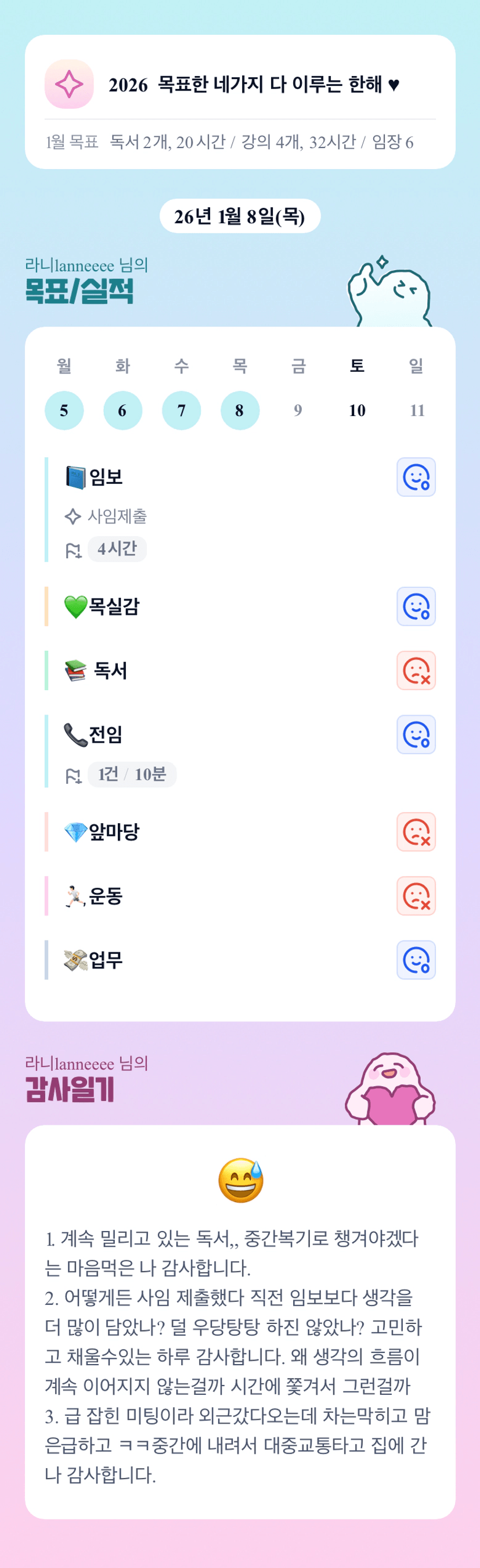 [2026 확언]1. 나는 2026년 12월 31일 목표한 지방 광역시 앞마당을 뽀갰다2. 나는 2026년 12월 목표한 대로 1호기 매도한다.3. 나는 2026년 관계로써 성장한다.4. 나는 2026년 마음맞는 동료들과 함께 즐겁게 일하고 있다.