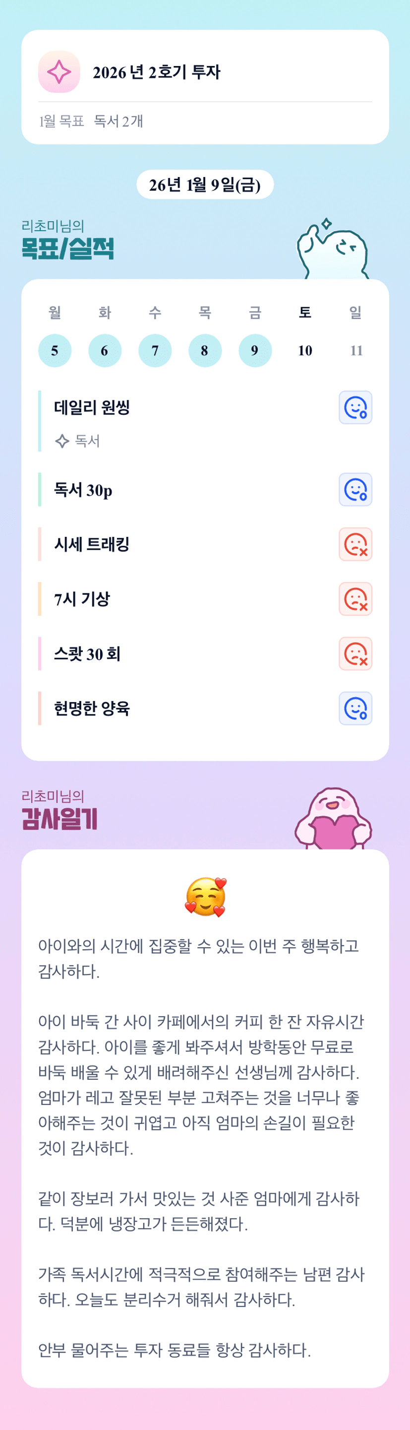 가족독서시간 너무 멋져요 주말 1시간 정도만이라도 저희가족도 한번 해봐야겠어요 최고최고~~~ 초미님~~저 진담튜터님 진행예정이신 새해플래닝도 신청했거든요 초미님은 이미 루틴이 잘잡히셔서 안해도 되시려나요? 요것도 톡방이 있는거 같던데 혹여 필요하심 한번 신청해보셔요 챌린지방에서 만남 넘나 반가울듯해요 봄이님도 신청하심 좋겠다요~~~♡