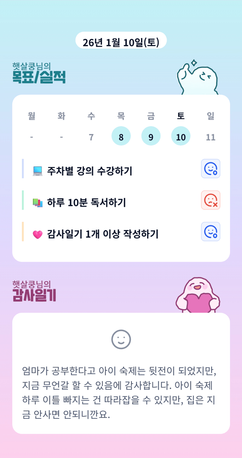 간단하게라도 목실감을 쓰니, 과제를 조금 한 날 혹은 무언가 마음이 흐지부지 다 관두고 싶다가도 뜨끔하며 오늘을 돌아보고 내일을 준비하게 되네요. 내마기가 끝나도 너나위님 말씀처럼 꾸준히 해 봐야 겠습니다.