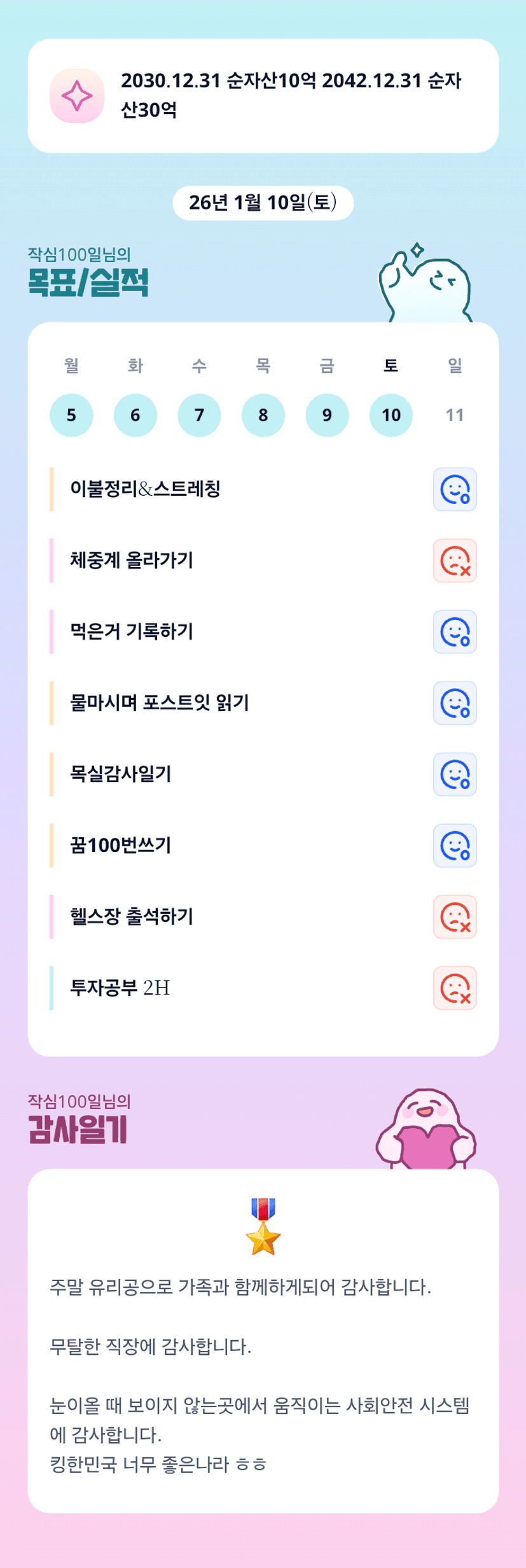 이불정리 → 스트레칭 → 컴퓨터 앞에서 물 마시면서 꿈 읽기 → 꿈100번쓰기 → 목실감 → 헬스장 출석(운동)