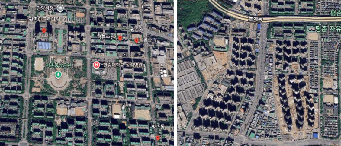 왼쪽의 반듯한 일자나 네모의 단지 구조는