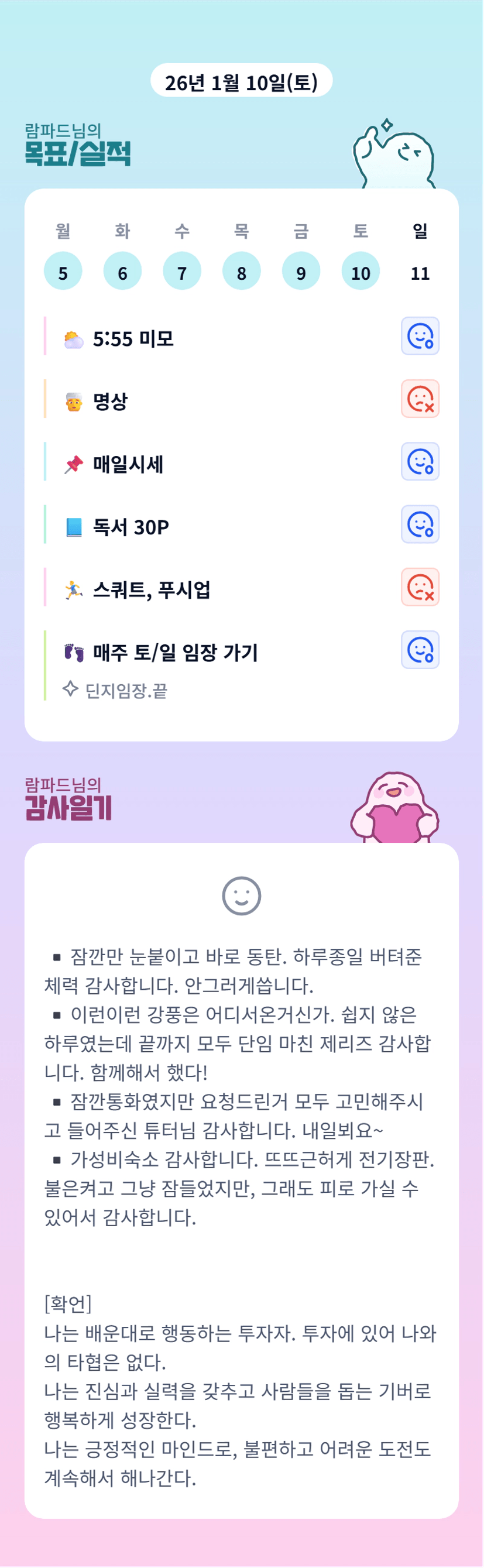 때와 장소를 가리지 않고 일어나서 목실감 쓰는 습관! 배워야겠네요👍