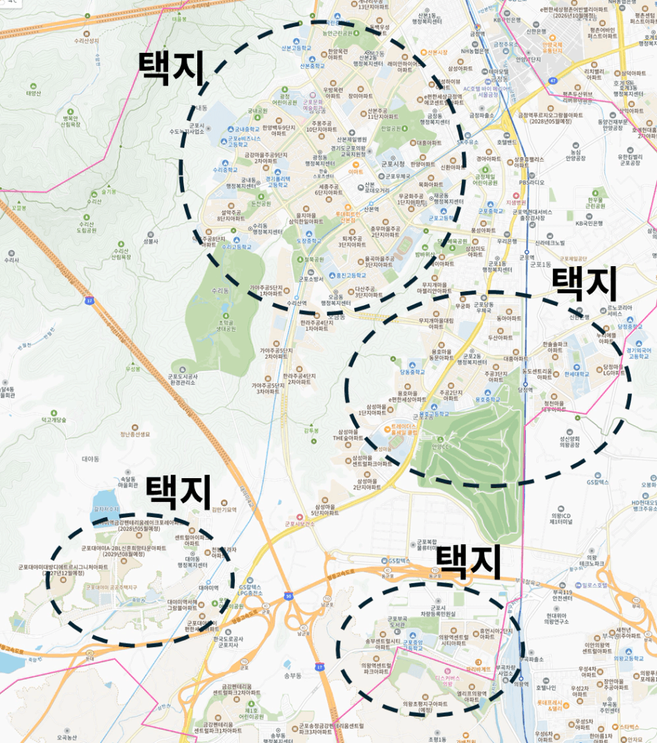 지도만 보더라도 아파트가 균질하게 몰려있는 곳은