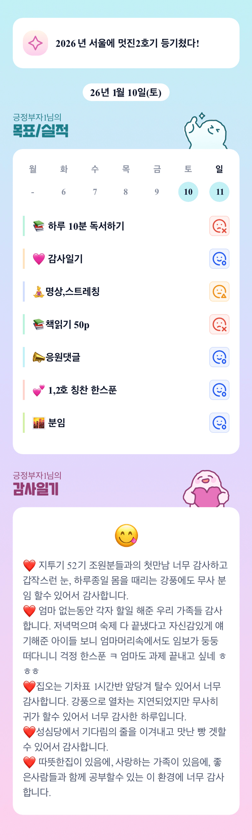 조장님🥰 첫 만남! 너무 너무 반갑고, 함께해주셔서잘 마무리했습니다^^ 부족한 임장루트였어서 현장 다녀오고 나니 부족한 점과 개선점이 보이더라구요! 그래도 차분한 조장님이 계셔서 넘 의지되고 든든되었답니다😊❤️🩷앞으로 남은 기간도 잘 부탁드려요^-^