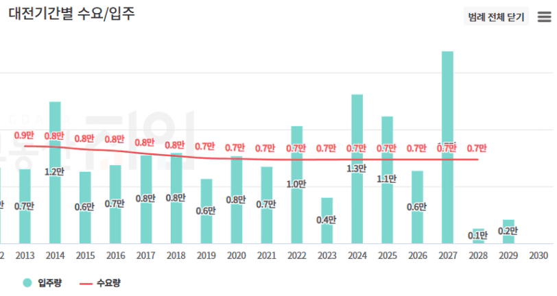 대전의 엄청난 공급량은 27년에 집중되어 있고 26년 투자를 한다면 28년 전세를 맞추고 나올 타이밍이므로 지금이다.