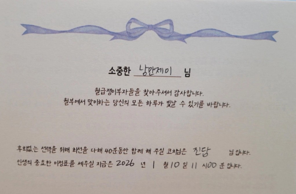 제이님, 오늘 만나뵈서 반가웠습니다^^ 어려운 시기이실 수 있는데 코칭 받으신 것 정말 잘하셨고 마음의 위로에다가 실질적인 도움까지 받으셨다니 저도 기쁘네요. 건강 잘 회복하시길 바랍니다!