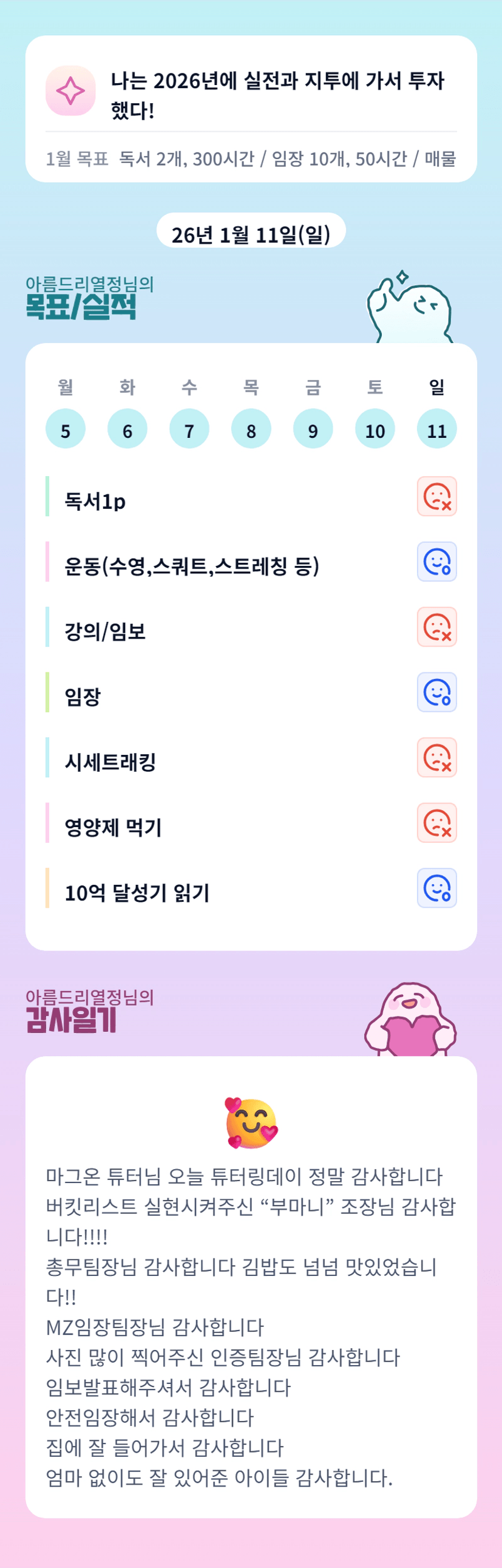 '부마니'조장님 감일 강조!!ㅎㅎㅎ어제 넘 고생 많으셨습니다 열정님: )일요일에 함께 임장해주시고 또 항상 잘 챙겨주셔서 항상넘 감사합니다ㅠㅠㅠ다음주에도 따뜻하게 챙겨입을게요!!ㅎㅎ열정님 이번주도 행복한 하루되세용!!