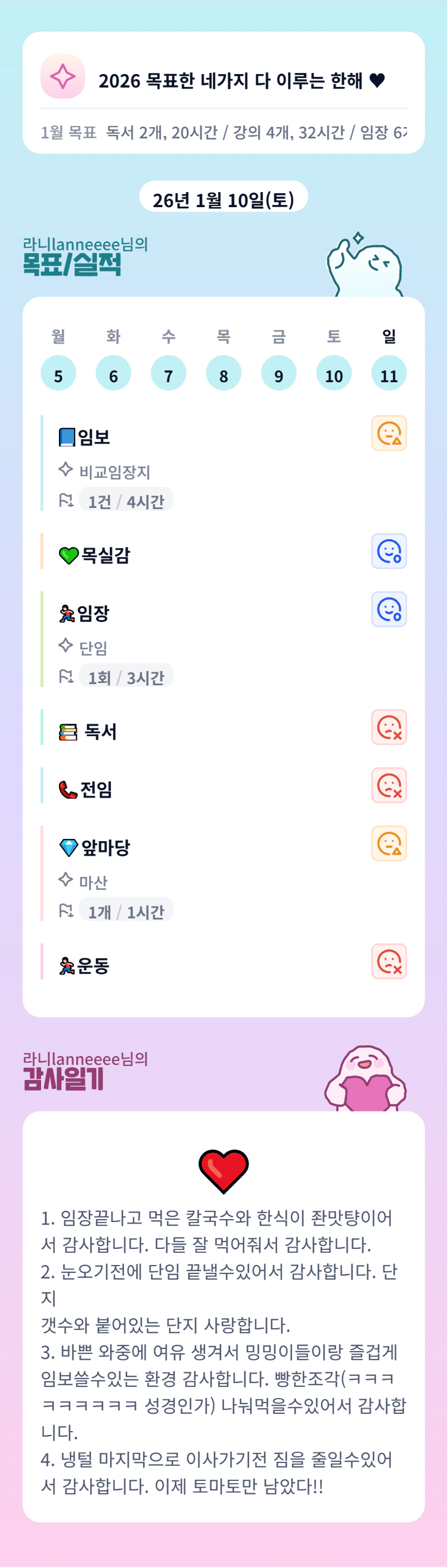 [2026 확언]1. 나는 2026년 12월 31일 목표한 지방 광역시 앞마당을 뽀갰다2. 나는 2026년 12월 목표한 대로 1호기 매도한다.3. 나는 2026년 관계로써 성장한다.4. 나는 2026년 마음맞는 동료들과 함께 즐겁게 일하고 있다.