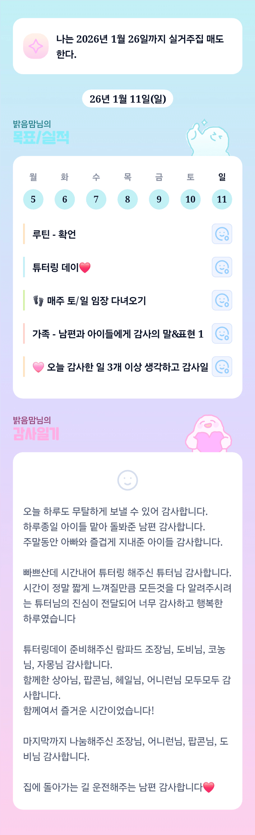 밝음맘님 같이 임장하면서 이야기 나누고 같이 성장할 수 있어서 감사합니다 ^^ 아이들과 먼길을 매주 오시기도 쉽지 않으실텐데 남편분께서 함께 해주시면 많이 힘이 될것 같아요~! 가족분들 모두 고생 많으셨습니다 :) 이번주도 화이팅이에용~^^