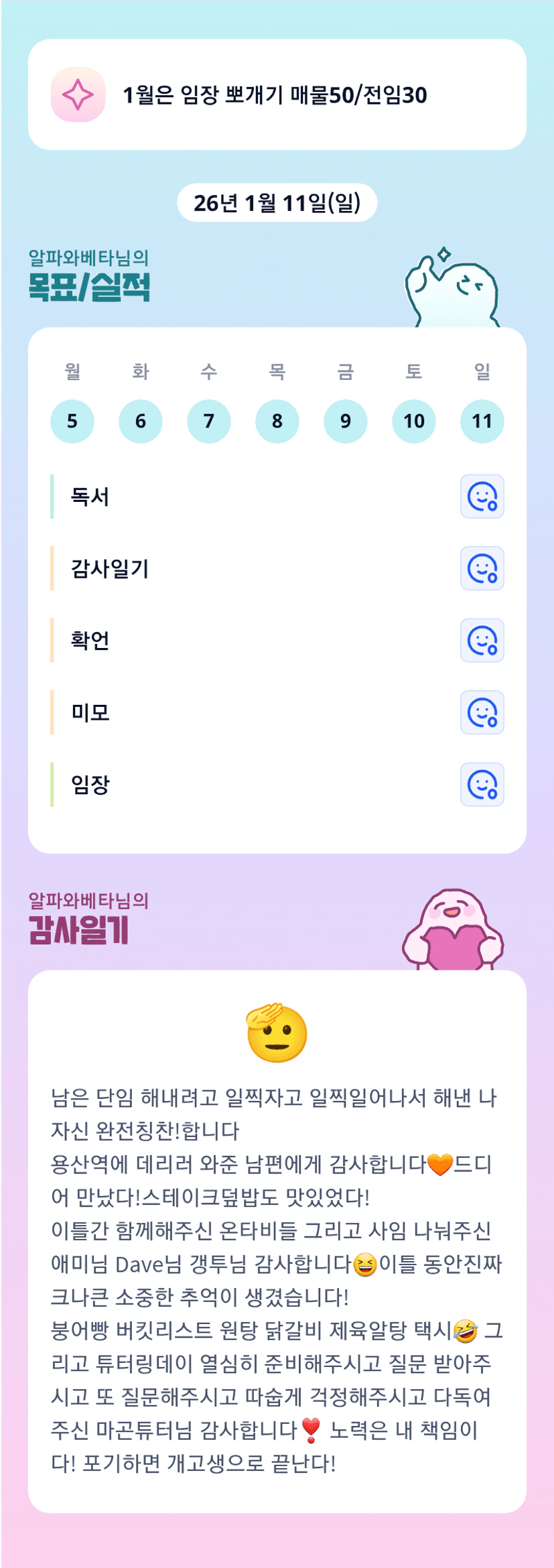 베타님 고생 많으셨어요:) 베타님과 새뱍 단임넘 좋았습니다!! 아니면 안했을 거 같아욯ㅎㅎ 감사해요 오늘도 빳팅입니다!!!