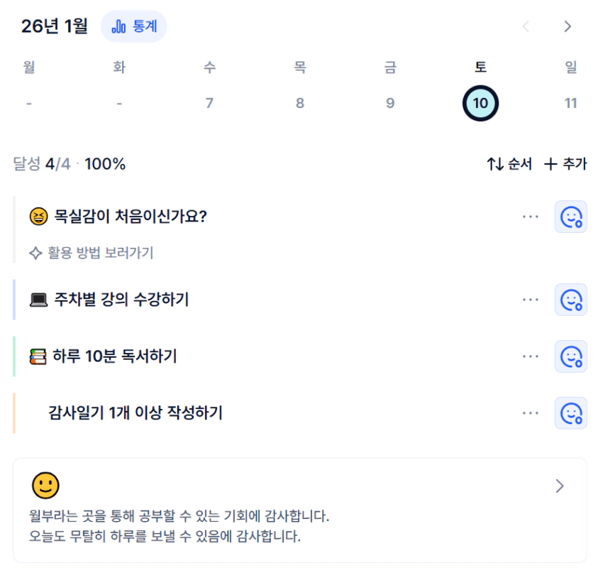 개인적으로 따로 루틴 체크나 목표 관리는 하고 있었지만 감사일기는 처음이라 너무 어색했다.