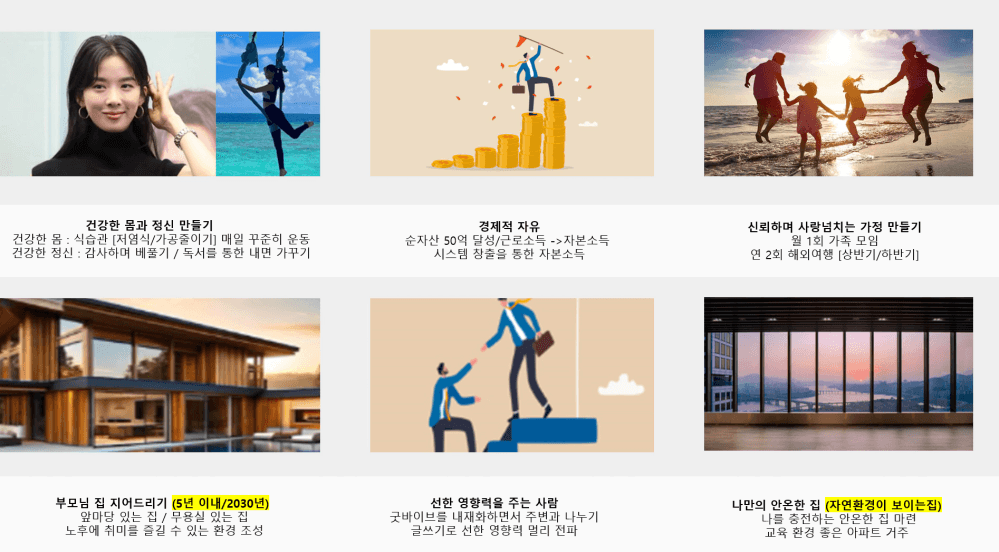 -> 비전보드의 과학성. 비전보드에 대해서 이야기하는 책이 은근히 많다. 비전보드를 가까이 출력해놓는것 만으로도, 도파민이 계속 보급되라는거라면 최고의 가성비 활동이 아닌가!