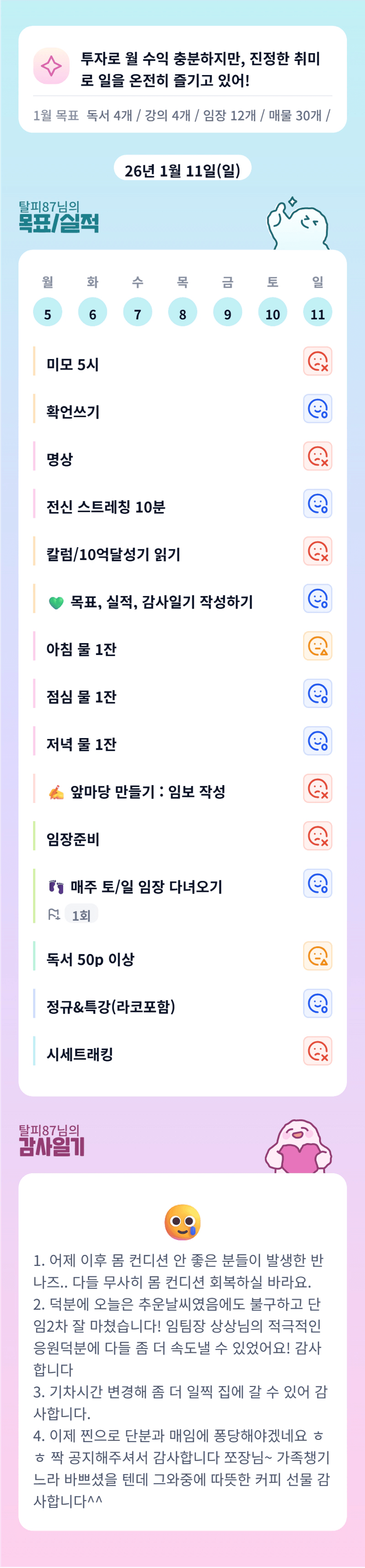이틀간 모진 날씨에 임장하느라 고생 많으셨습니다 ㅎㅎ 탈피님 특유의 밝음 덕분에 저도 이틀 즐겁게 임장 할 수 있었습니다 ㅎㅎ 중간중간 당 보충 담당해주셔서 정말 감사했어요 ㅋㅋㅋㅋ 이제 매임과 결론 남았네요!! 조금만 더 힘냅시다 화이팅〰️