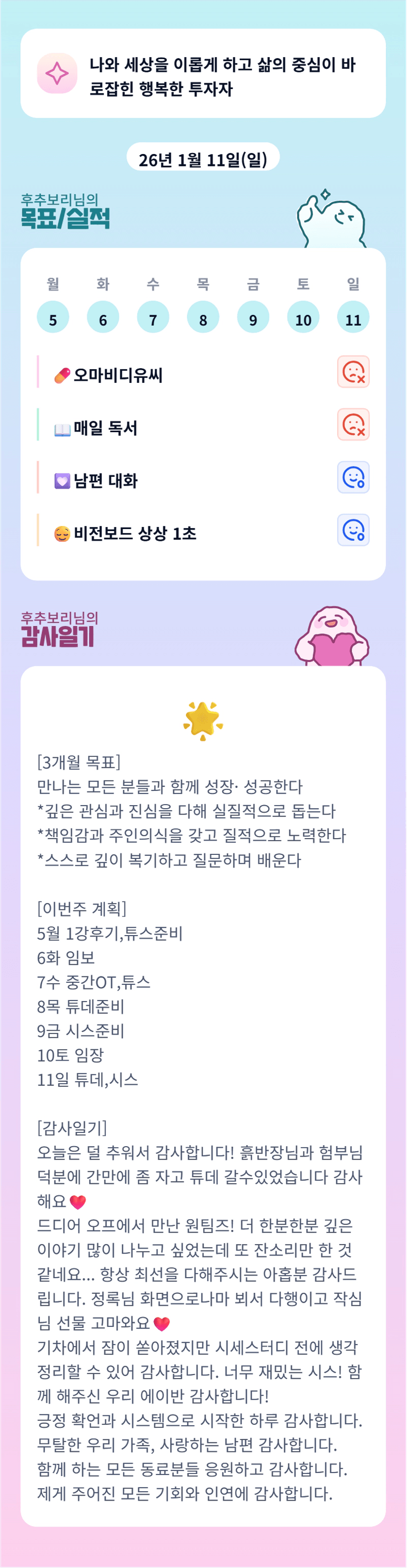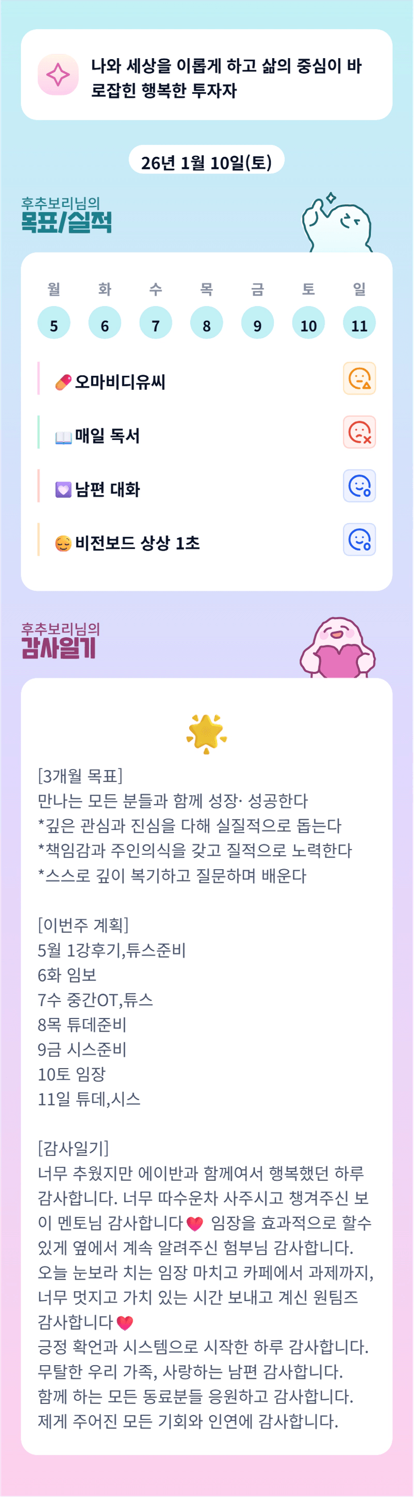 튜터님 덕분에 처음 경험하는 튜터링데이에서 신세계를 경험하고 다 담지 못할 너무나 소중한 피드백도 많이 받았습니다. 하나라도 더 주시려고 눈마주칠 때마다 질문없어요? 라고 말해주셔서 너무 감사했습니다. 소중한 경험 마음에 새기고 단단한 투자자가 되겠습니다. 튜터님 정말 수고 많으셨어요!😊🫶
