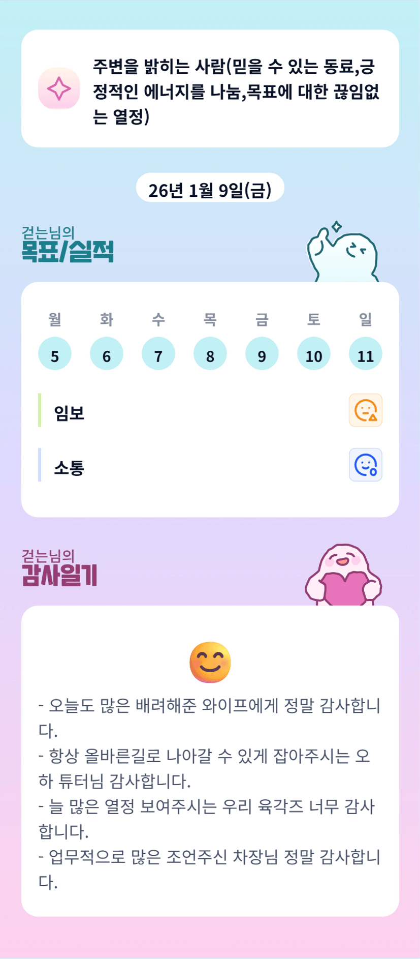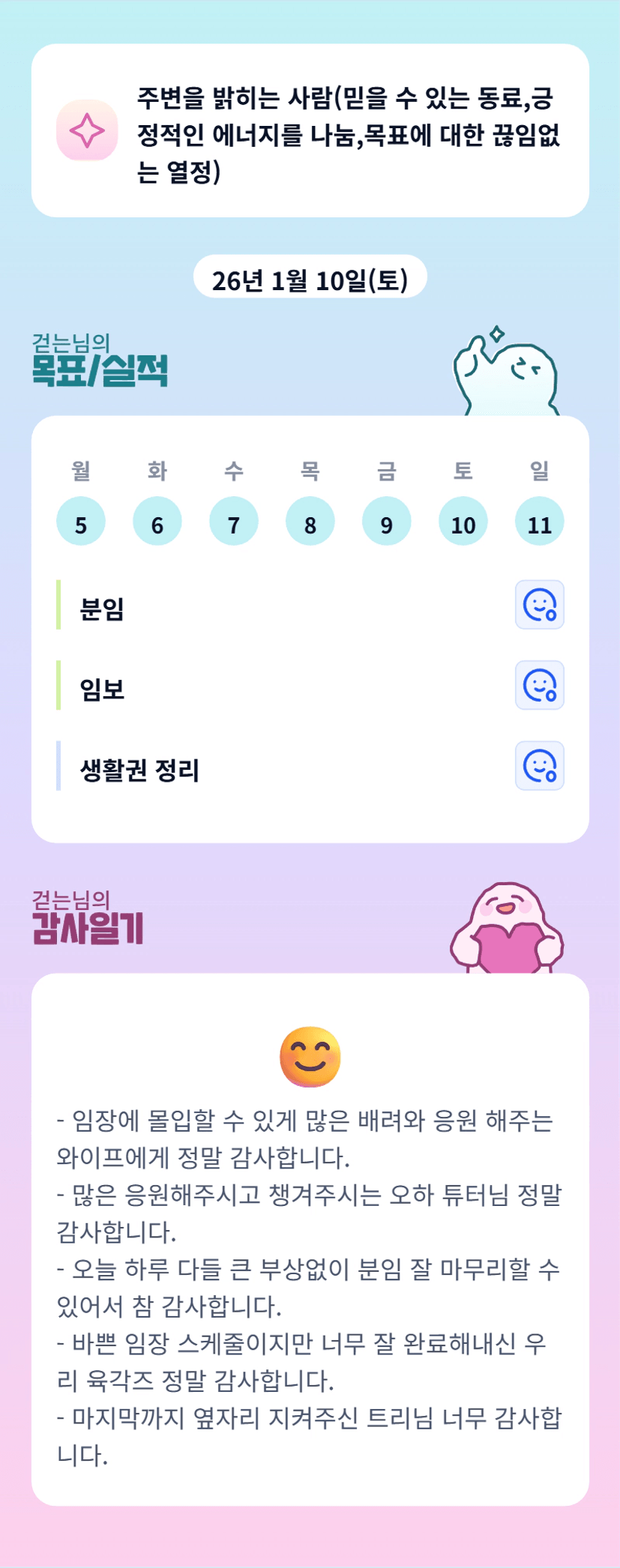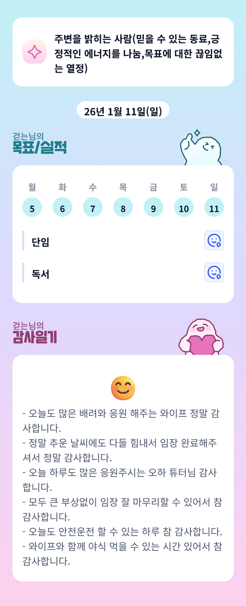 걷는님~~ 주말 동안 진짜 넘 추웠는데 고생 많으셨어요!! 나는님의 적극적인 지지 넘 부럽고 제가 다 감사하네요 ㅎㅎㅎ 이번주도 해야 할 일들로 채워가시면서 뚜벅뚜벅 화이팅입니다!!!♥