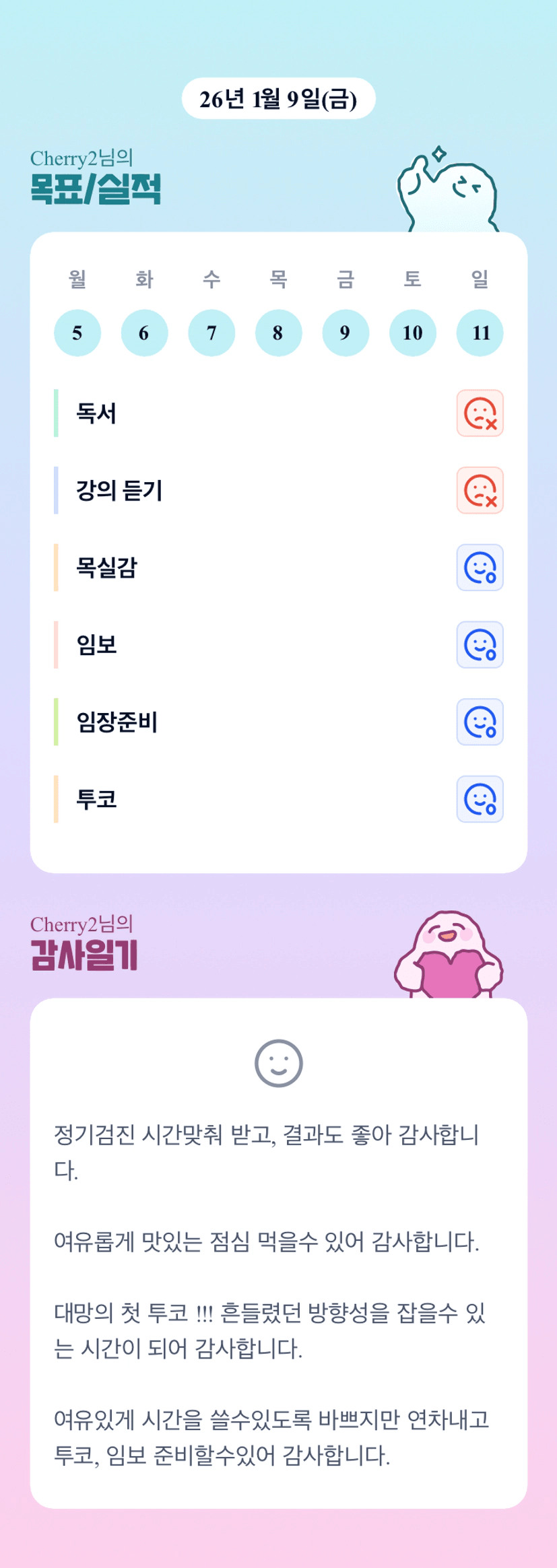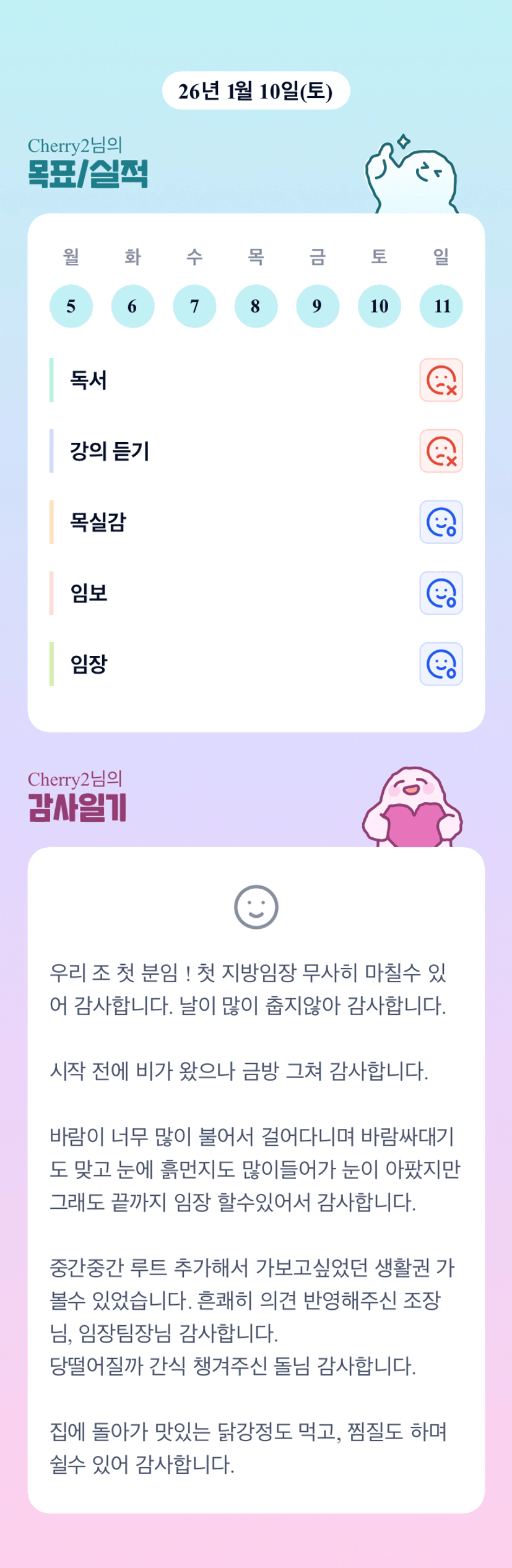 오 투코! 다녀오셨습니까 체리님 ㅎㅎㅎㅎ 광클 성공하셨군요,,, 부럽습니다! 어떠셨나요!? 만족 하셨습니까!? 저도 도전 해보겠습니다~~ 분임, 단임 이틀 임장 다녀오신다고 너무 고생 많으셨습니다!