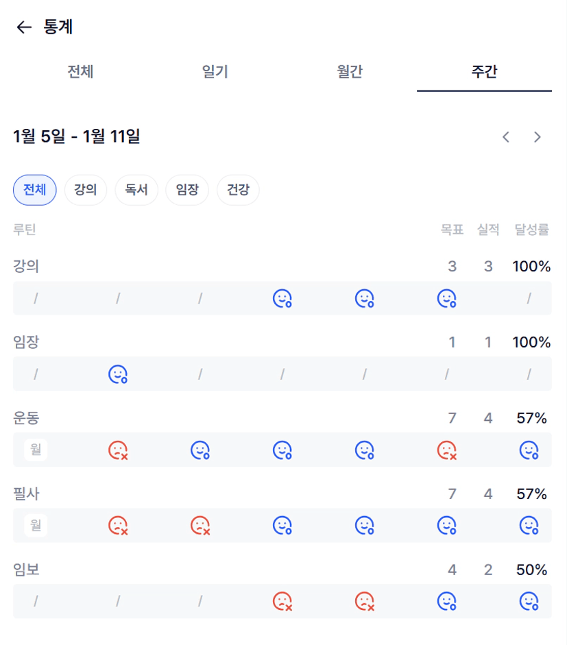 1️⃣ 목실감 - 통계 - 주간으로 들어가 이번주 나의 목실감 현황을 인증해주세요 ! :)