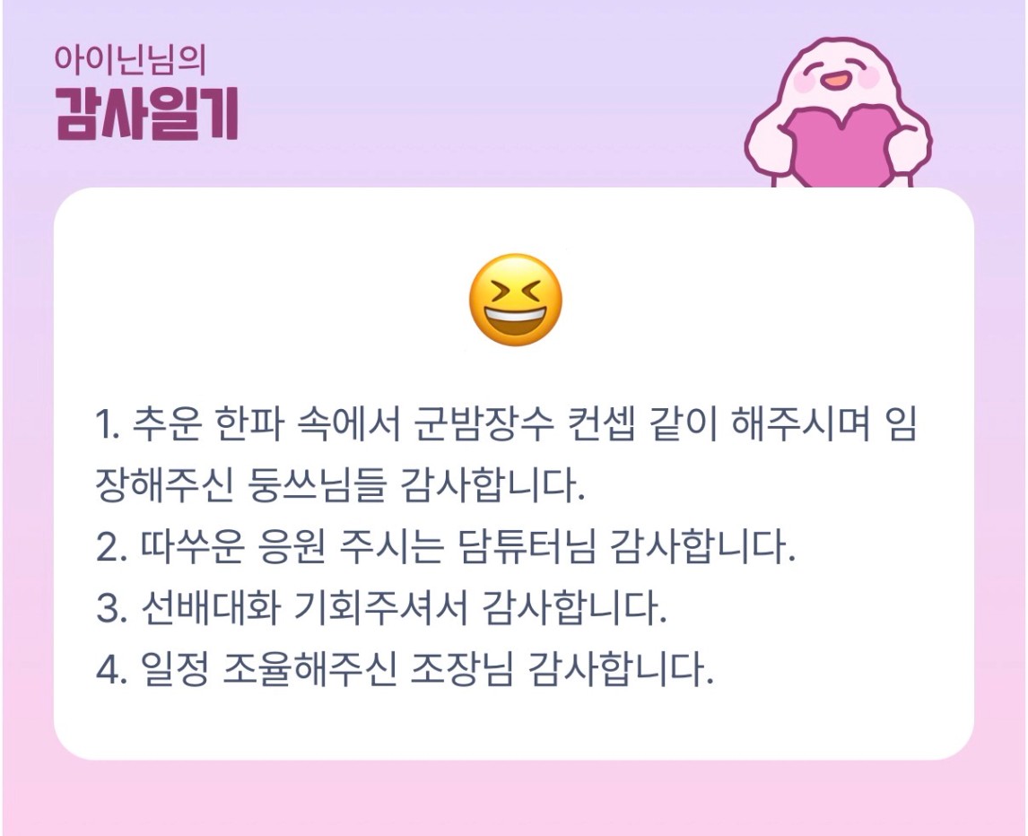 이닌님 주말 동안 함께 해서 넘 좋았습니다 이번주도 빠이팅하셔요~~