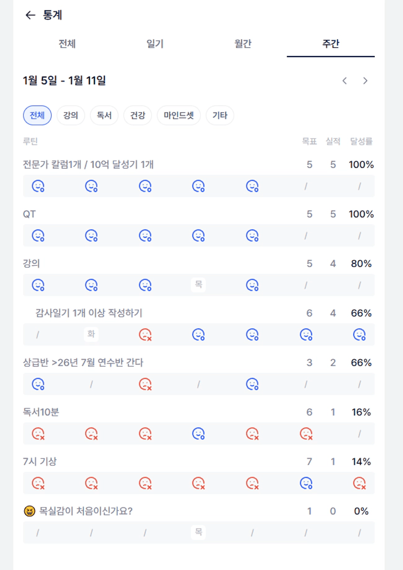 2️⃣ 이번 주 목실감을 작성하면서 느낀점과 더불어 한 주 스스로 어떻게 지냈는지 간단한 회고를 적어보아요 :) 독서와 기상시간 이번주는 보완하도록!!