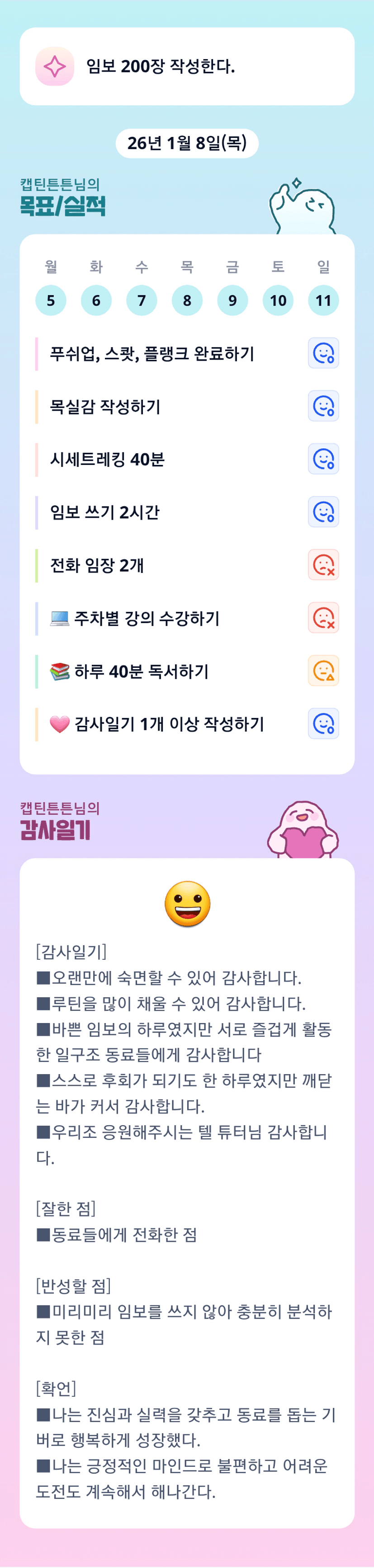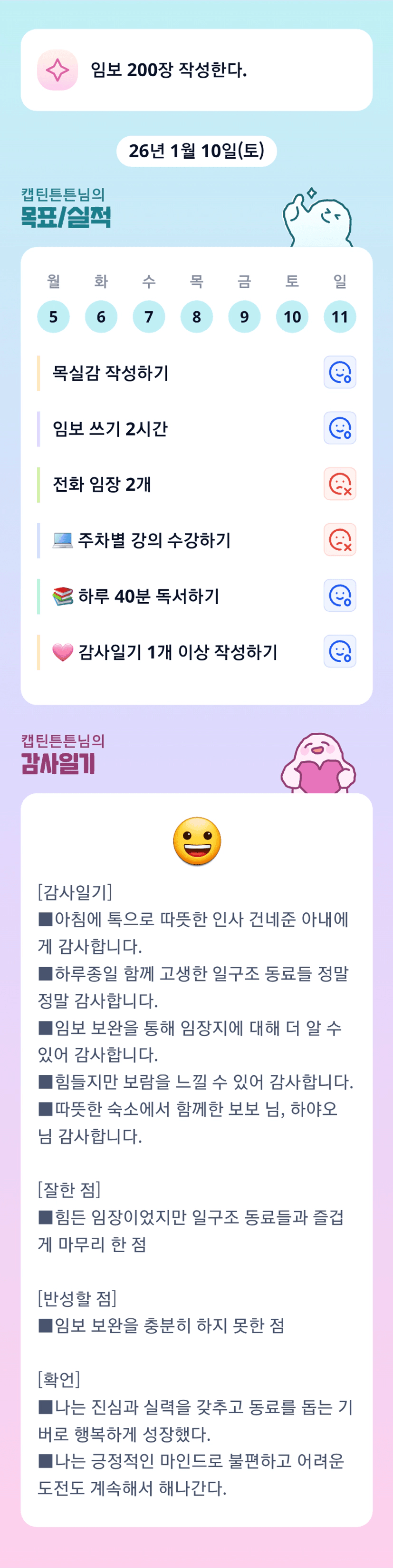 조장님!! 잘 이끌어주셔서 너무 감사드립니다 부드러우면서도 그속에 드러나는 리더십의 모습을 보고 많이 배웠습니다 파이팅입니다!!