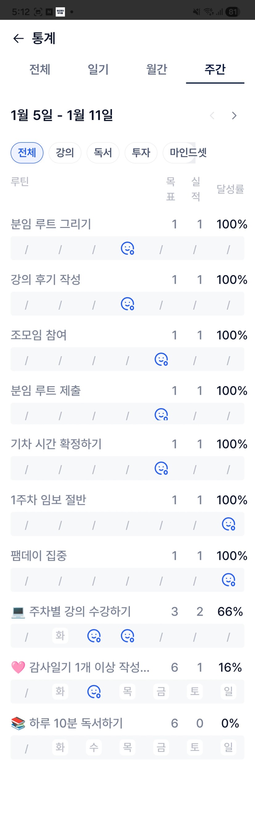 1️⃣ 목실감 - 통계 - 주간으로 들어가 이번주 나의 목실감 현황을 인증해주세요 ! :)