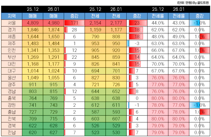 전국 시세 동향 및 서울/경기 가격, 투자금 현황_26년 1월 [골드트윈]