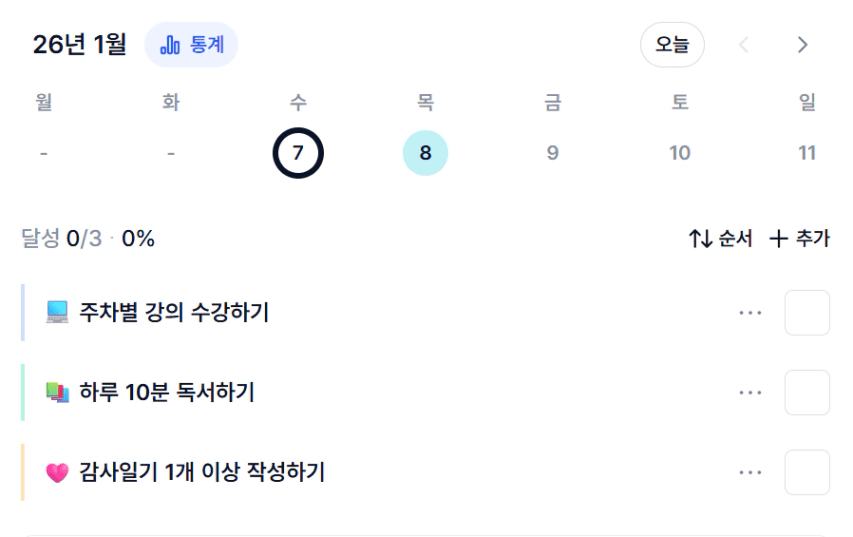 1주차… 부족함이 많은 목실감을 반성하며… 2주차 때는 습관이 될 수 있도록 노력하겠습니다.