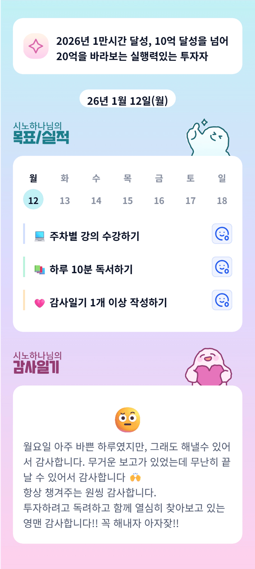 회사도 소홀히 하지 않으면서 투자도 집중하시는 조장님 진짜 최고! 오늘 하루도 수고하셨어요~ 항상 힘내시죠~ 아자잦!!!!