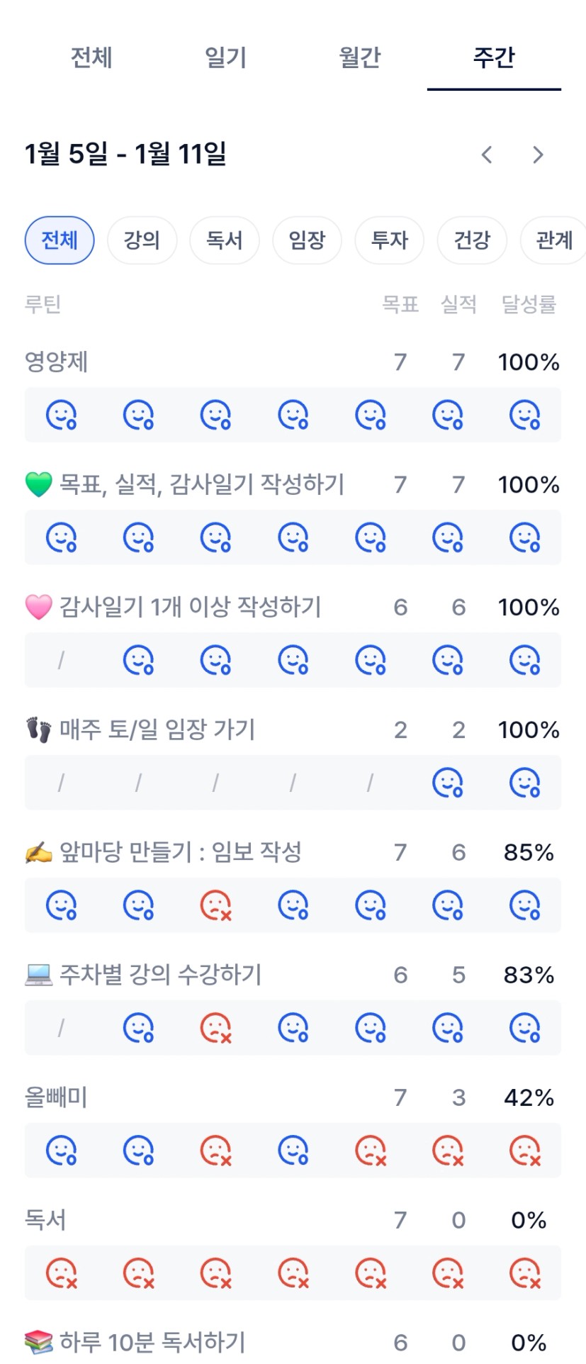 예) 토요일부터 목요일까지 목실감을 쭉 하루하루 적어보면서 스스로 중요한 부분은 놓치지 않고 해낸 것 같아 뿌듯하다.