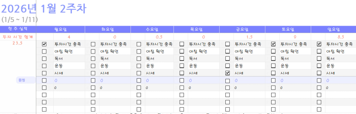 예) 토요일부터 목요일까지 목실감을 쭉 하루하루 적어보면서 스스로 중요한 부분은 놓치지 않고 해낸 것 같아 뿌듯하다.