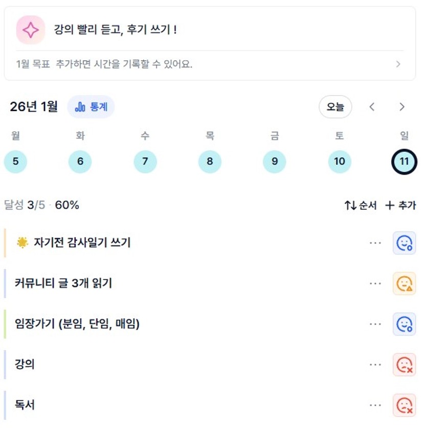 다만, 내가 강의를 소홀히 들었던 날도 있었고, 그런 날은 마음이 불편했는데 앞으로는 하루에 1차시라도 듣고 자야겠다는 생각이 든다. (나를 위해! ㅎㅎ)