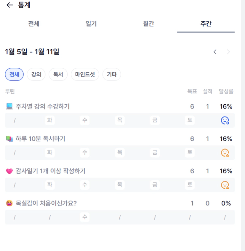 1️⃣ 목실감 - 통계 - 주간으로 들어가 이번주 나의 목실감 현황을 인증해주세요 ! :)