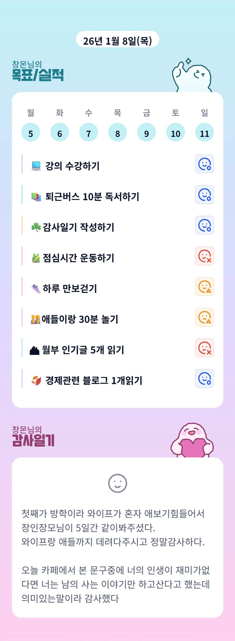 감사 일기도 자꾸 안쓰게되는데, 긍정적인 마인드 함양을 위해 감사일기를 더욱 열심히 쓰자!